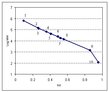 产品的样品:1. 甲状腺球状蛋白(670kD), 2. IgG(150kD), 3. BSA双聚体(132kD), 4. BSA (66kD), 5. 卵清蛋白(44kD), 6. 肌红蛋白(17.6kD), 7. 溶菌酶(14.3kD), 8. B12 (1.35kD), 9. 尿嘧啶(120D)